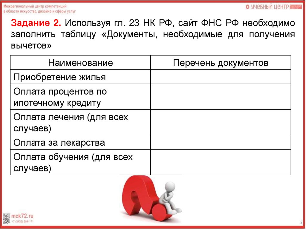 Задание 2. Используя гл. 23 НК РФ, сайт ФНС РФ необходимозаполнить таблицу «Документы, необходимые для получения