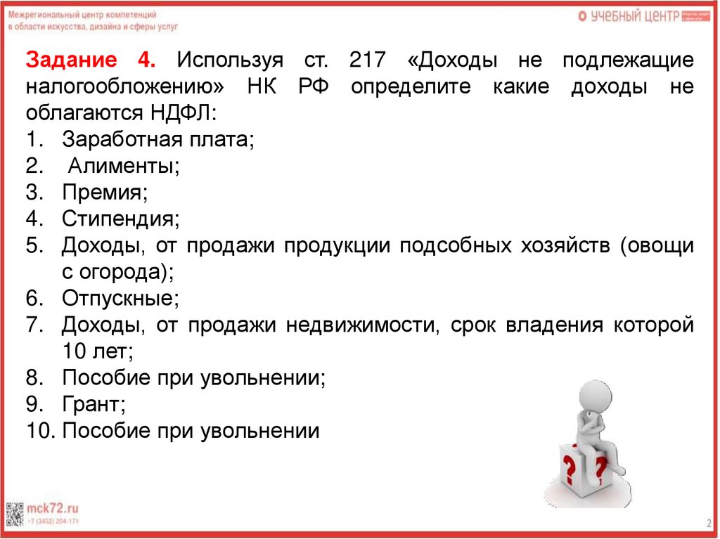 Задание 4. Используя ст. 217 «Доходы не подлежащиеналогообложению» НК РФ определите какие доходы не