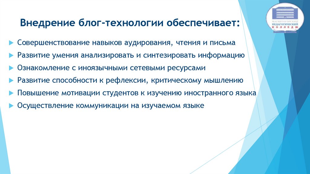 Внедрение блог-технологии обеспечивает:Совершенствование навыков аудирования, чтения и письма