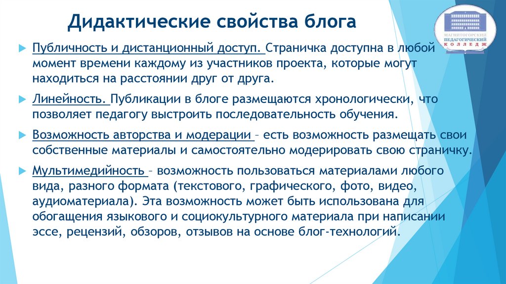 Дидактические свойства блогаПубличность и дистанционный доступ. Страничка доступна в любой