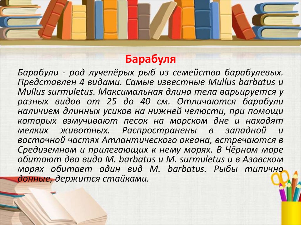 БарабуляБарабули - род лучепёрых рыб из семейства барабулевых.