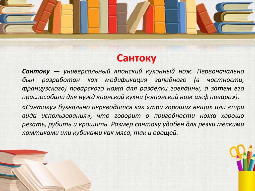 СантокуСантоку — универсальный японский кухонный нож. Первоначально