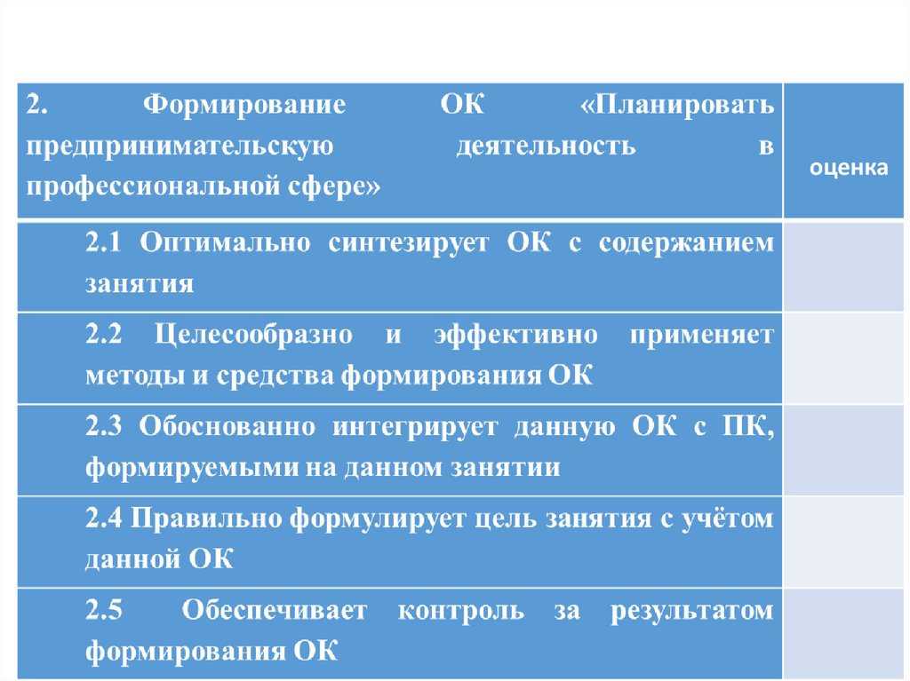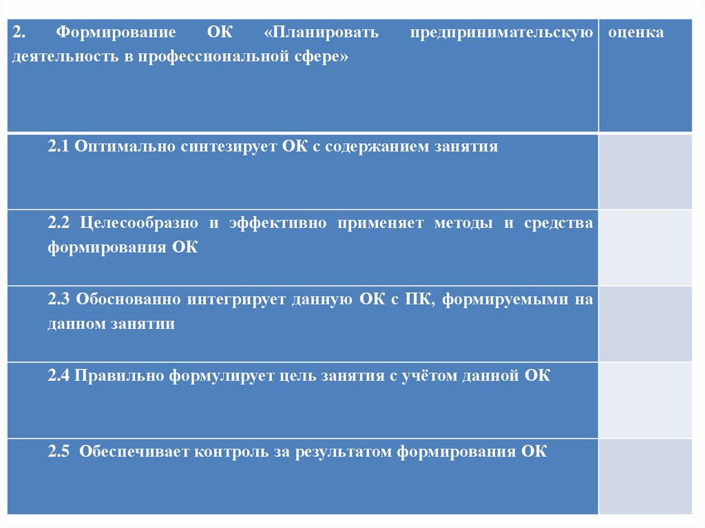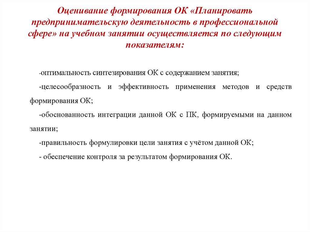 Оценивание формирования ОК «Планироватьпредпринимательскую деятельность в профессиональной