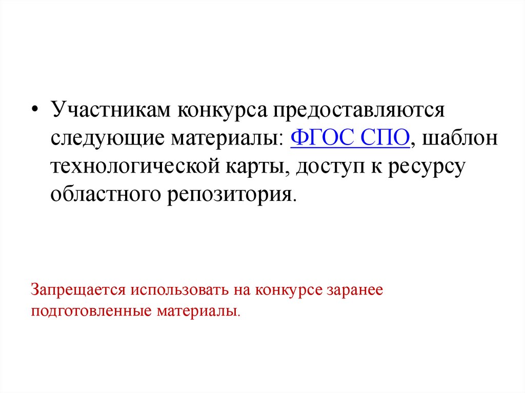 • Участникам конкурса предоставляютсяследующие материалы: ФГОС СПО, шаблон