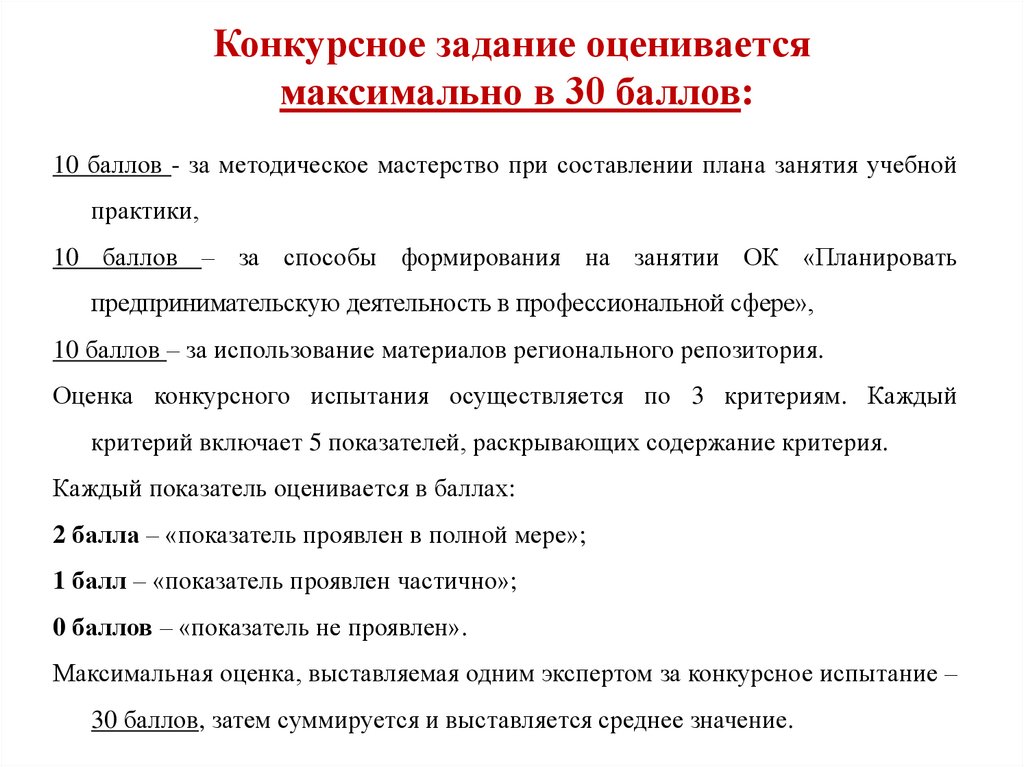 Оценка конкурсного испытания осуществляется по 3 критериям. Каждый