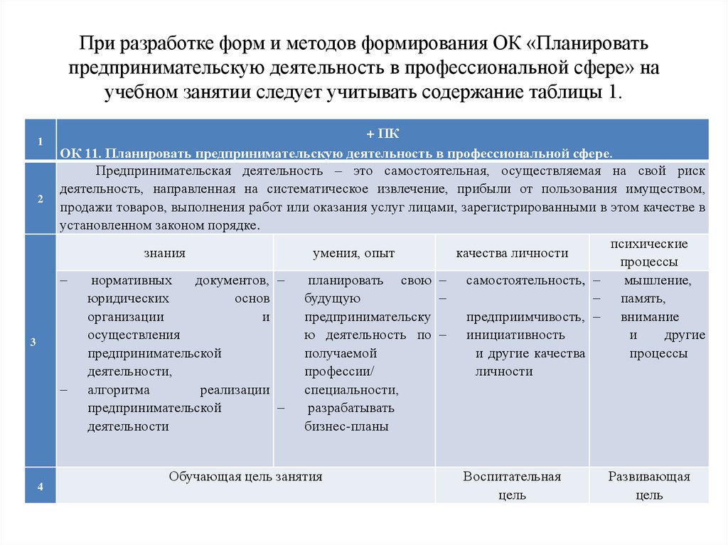 При разработке форм и методов формирования ОК «Планироватьпредпринимательскую деятельность в профессиональной сфере» на