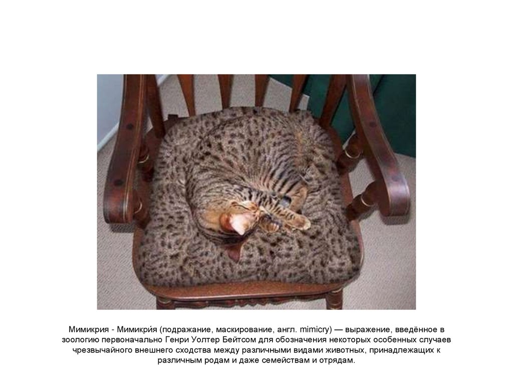 Мимикрия - Мимикри́я (подражание, маскирование, англ. mimicry) — выражение, введённое взоологию первоначально Генри Уолтер Бейтсом для обозначения некоторых особенных случаев