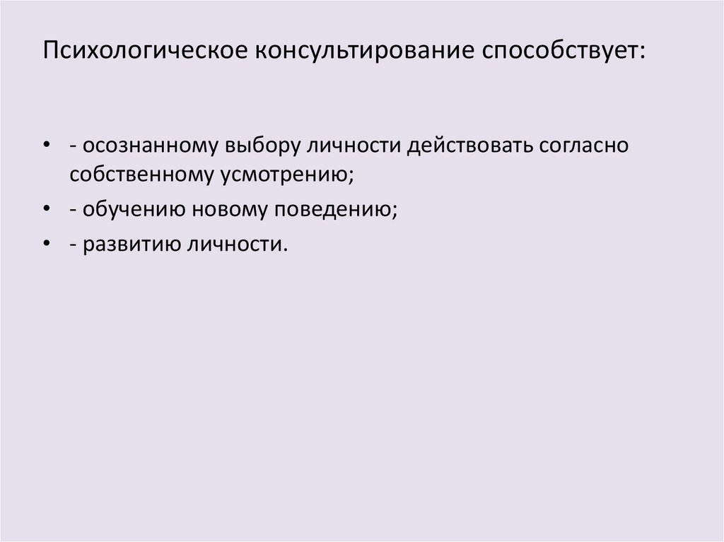 Психологическое консультирование способствует:• - осознанному выбору личности действовать согласно