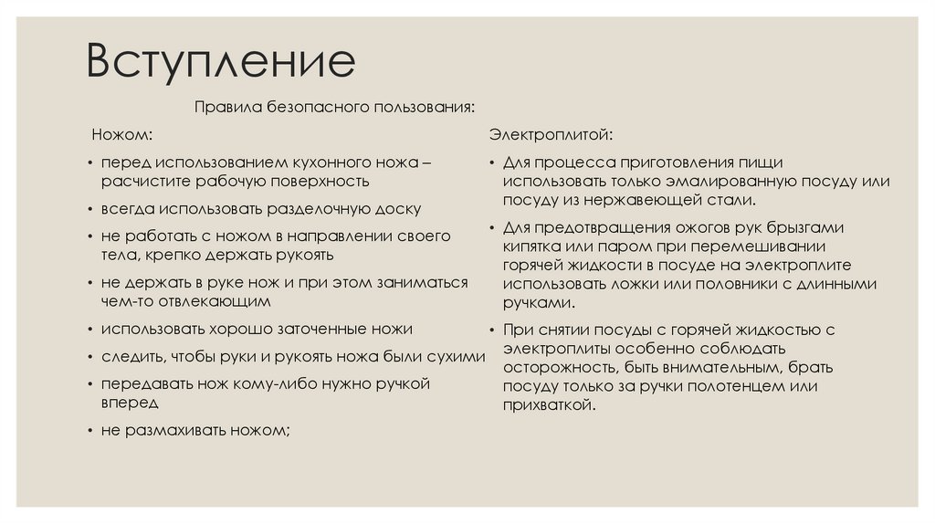 • следить, чтобы руки и рукоять ножа были сухими электроплиты особенно соблюдать