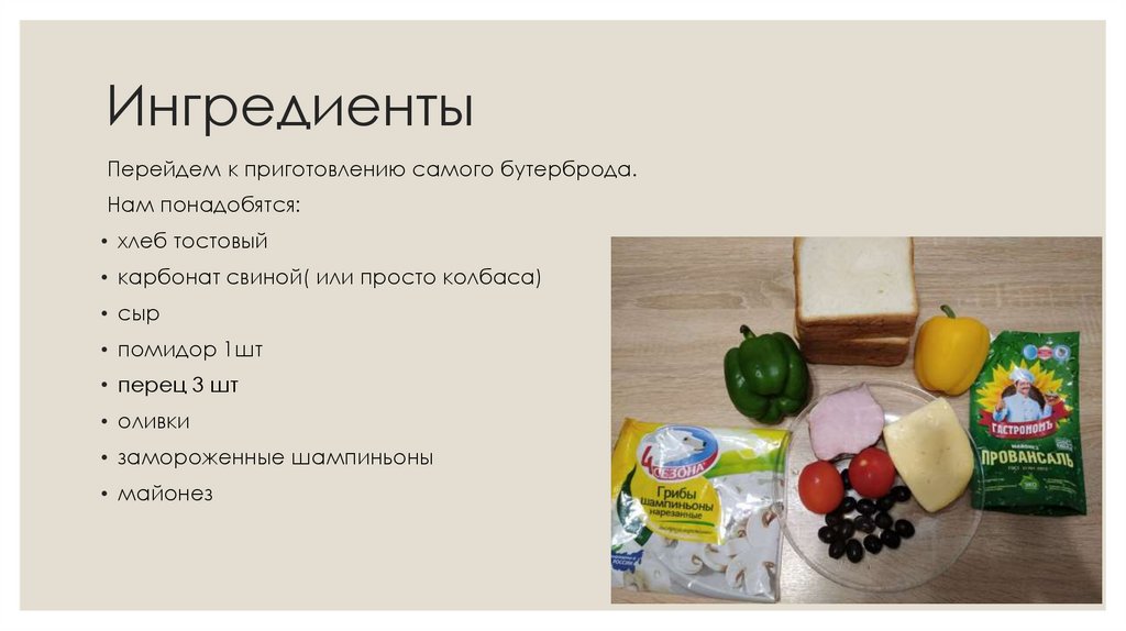 ИнгредиентыПерейдем к приготовлению самого бутерброда.