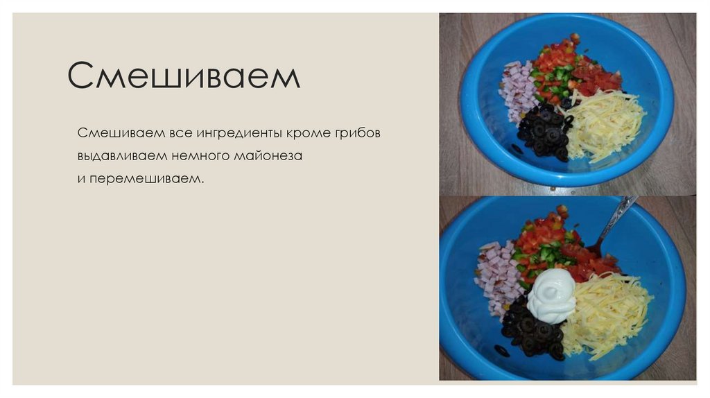 СмешиваемСмешиваем все ингредиенты кроме грибов