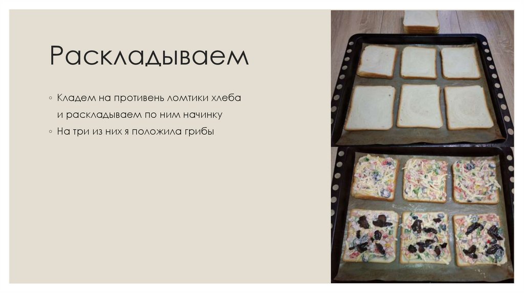 Раскладываем◦ Кладем на противень ломтики хлеба