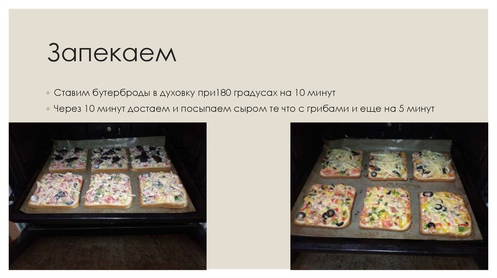 Запекаем◦ Ставим бутерброды в духовку при180 градусах на 10 минут