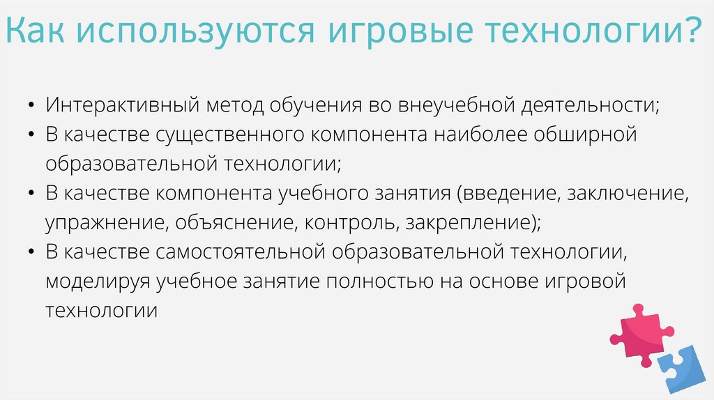 Как используются игровые технологии?• Интерактивный метод обучения во внеучебной деятельности;