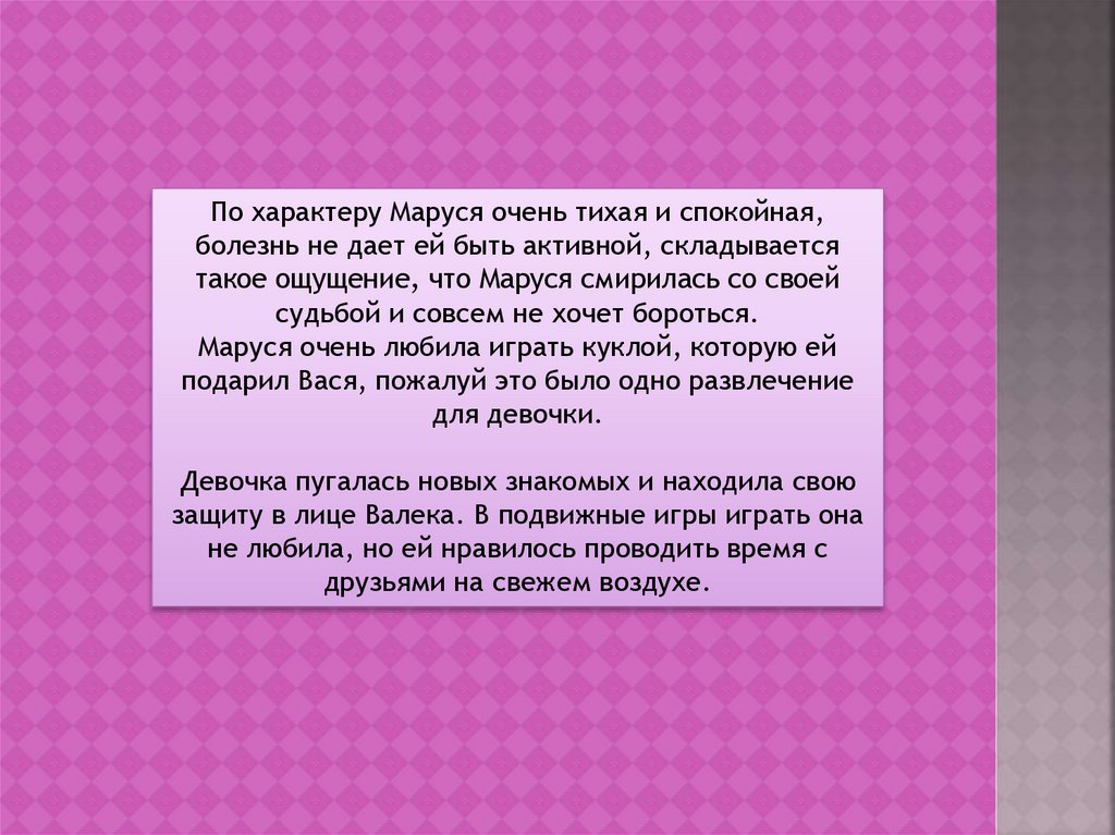 По характеру Маруся очень тихая и спокойная,болезнь не дает ей быть активной, складывается