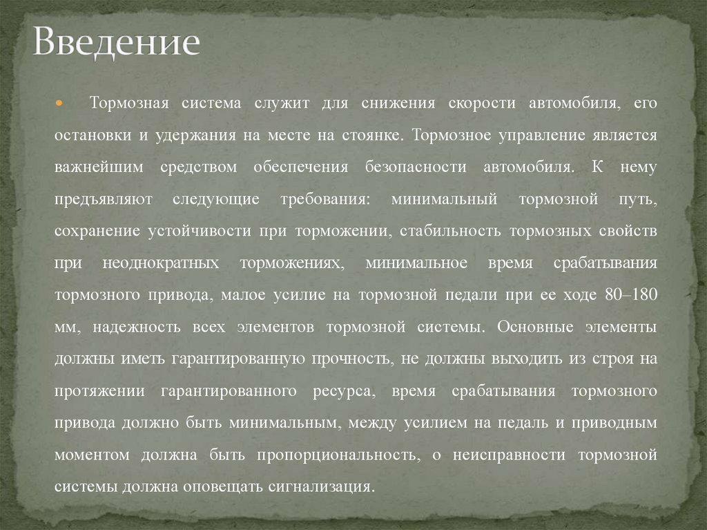 Тормоза должны быть надежными. Тормоза должны обеспечивать регулированиескорости автомобиля и его остановку с необходимым замедлением. Для этой цели во всех