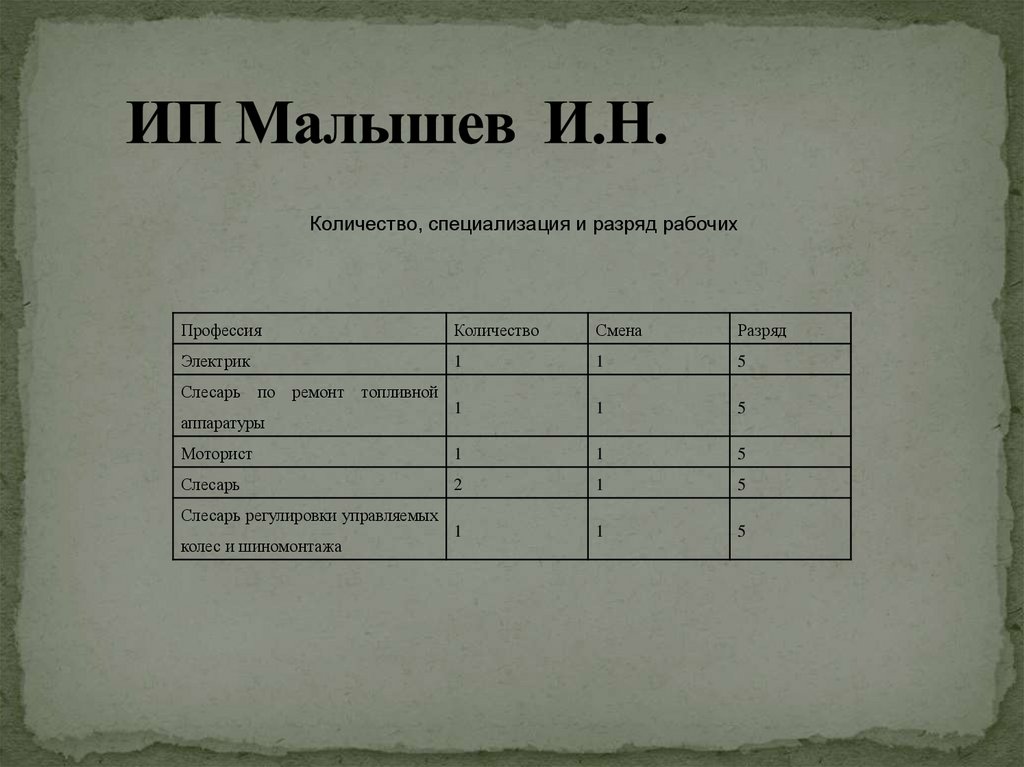 Количество, специализация и разряд рабочихПрофессия