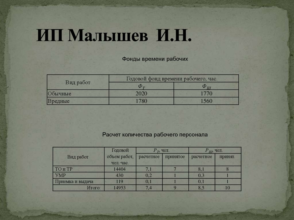 ИП Малышев И.Н. работает 305 дней в году.Работа