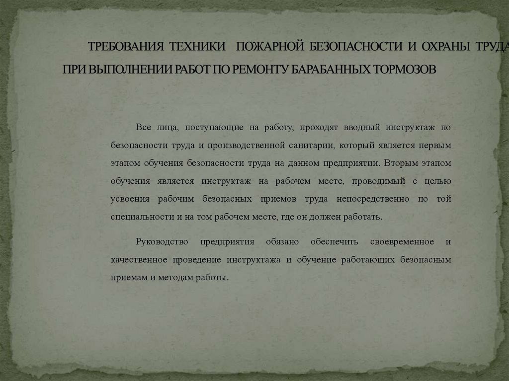 участке ремонта барабанных тормозов, соблюдения пожарной безопасность.