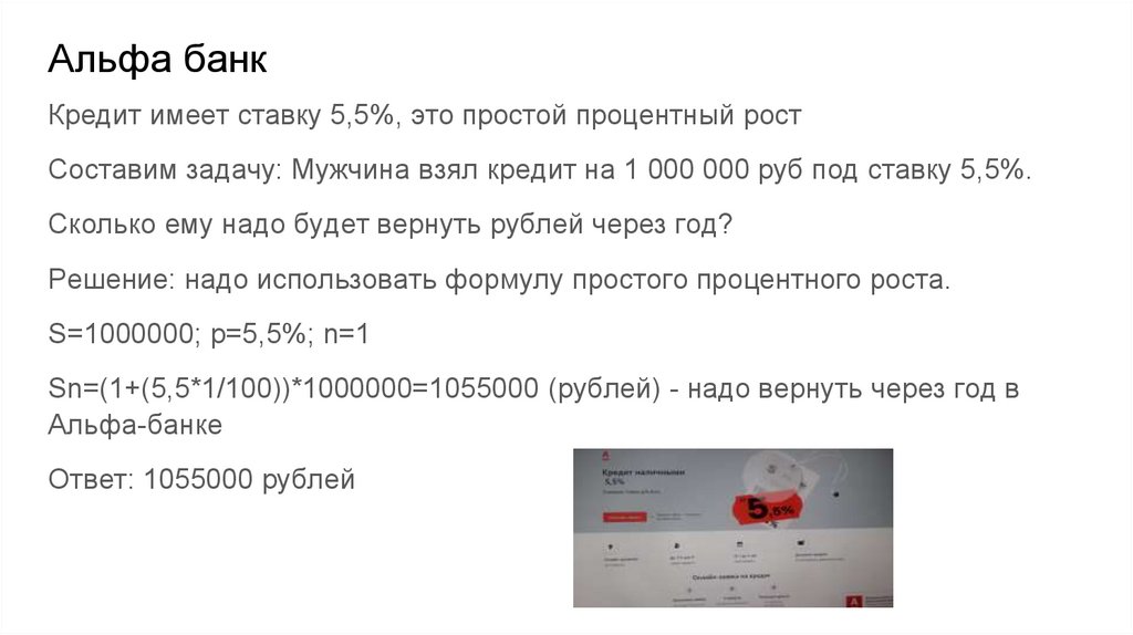 Альфа банкКредит имеет ставку 5,5%, это простой процентный рост