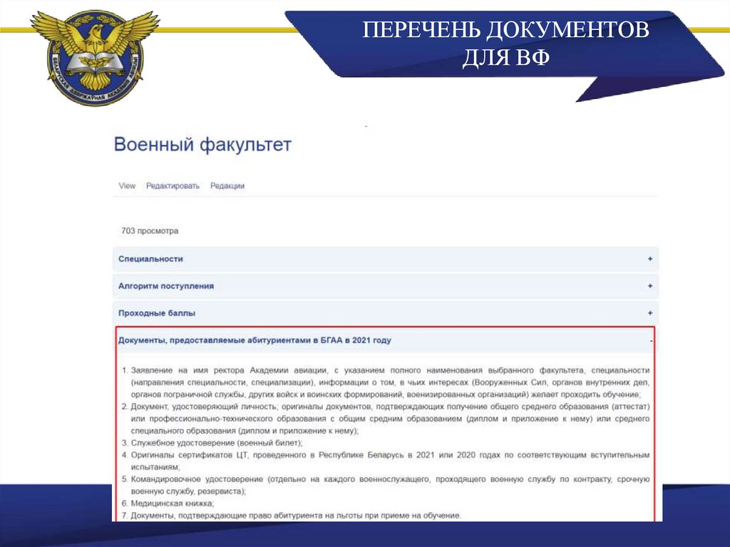 ПЕРЕЧЕНЬ ДОКУМЕНТОВДЛЯ ВФ
