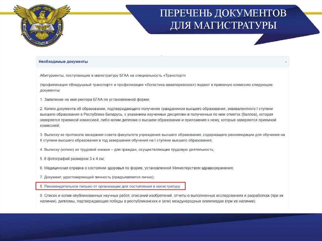 ПЕРЕЧЕНЬ ДОКУМЕНТОВДЛЯ МАГИСТРАТУРЫ