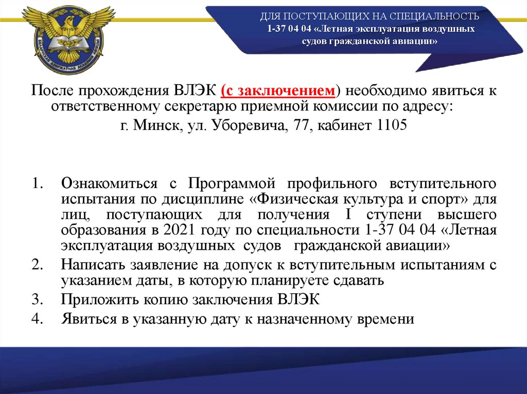 ДЛЯ ПОСТУПАЮЩИХ НА СПЕЦИАЛЬНОСТЬ1-37 04 04 «Летная эксплуатация воздушных