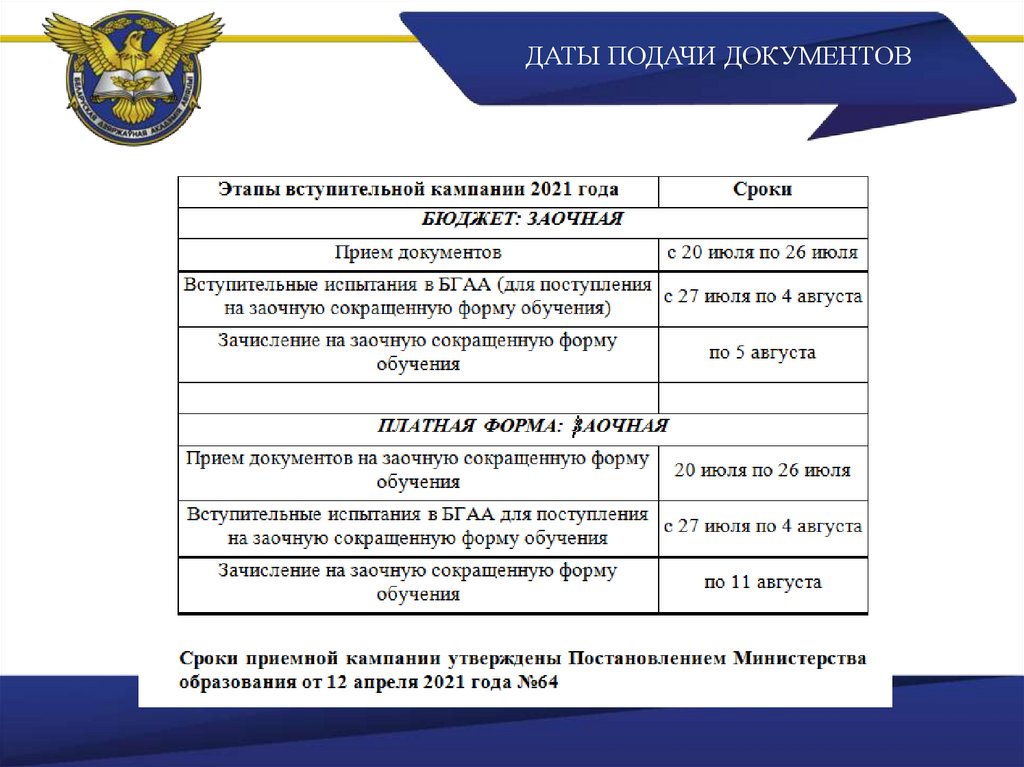 ДАТЫ ПОДАЧИ ДОКУМЕНТОВ43.
