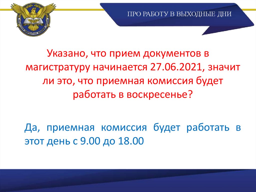ПРО РАБОТУ В ВЫХОДНЫЕ ДНИУказано, что прием документов в