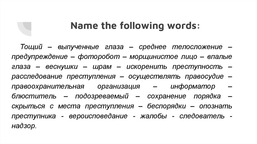 Name the following words:Тощий – выпученные глаза – среднее телосложение –