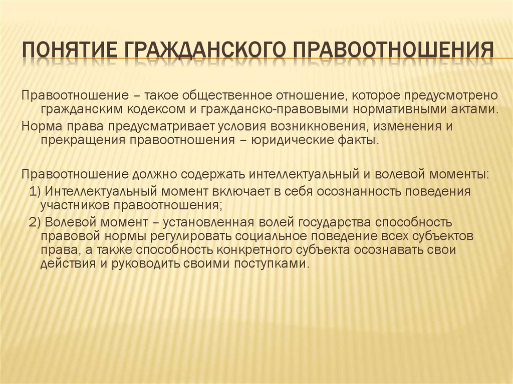 Правоотношение должно содержать интеллектуальный и волевой моменты: