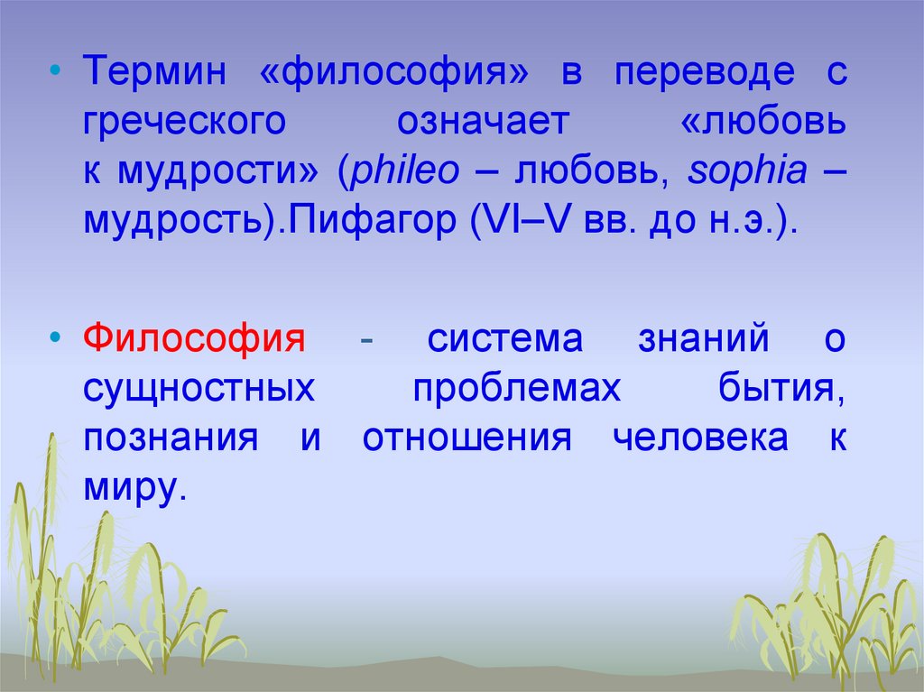 • Термин «философия» в переводе сгреческого
