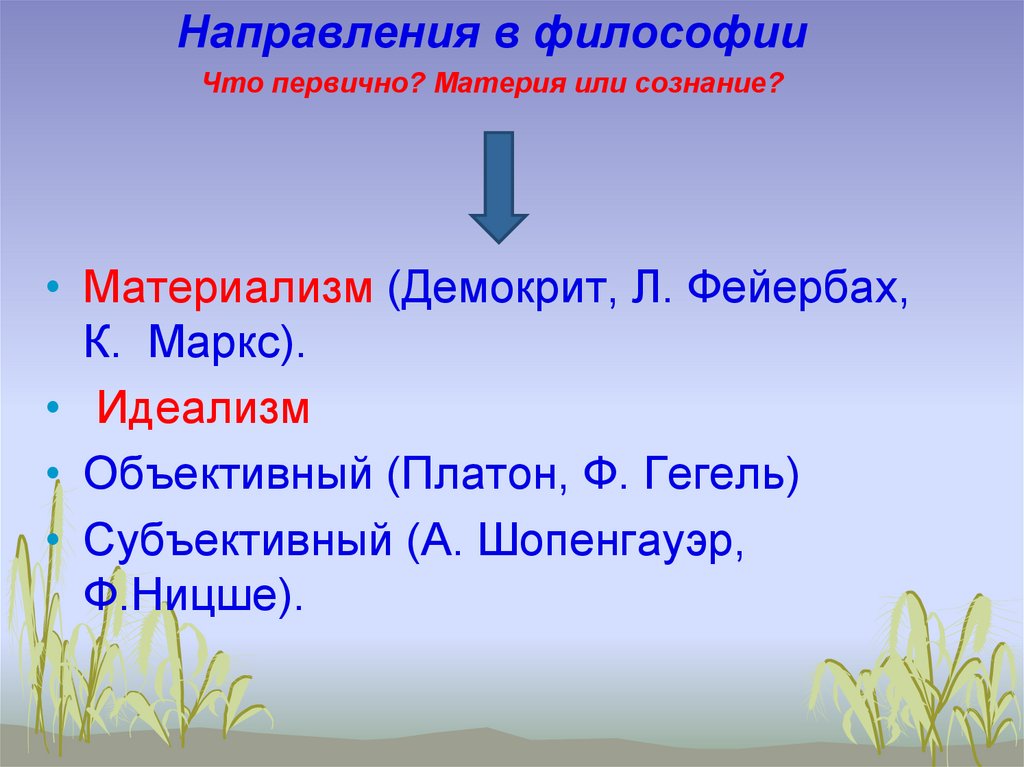 • Материализм (Демокрит, Л. Фейербах,