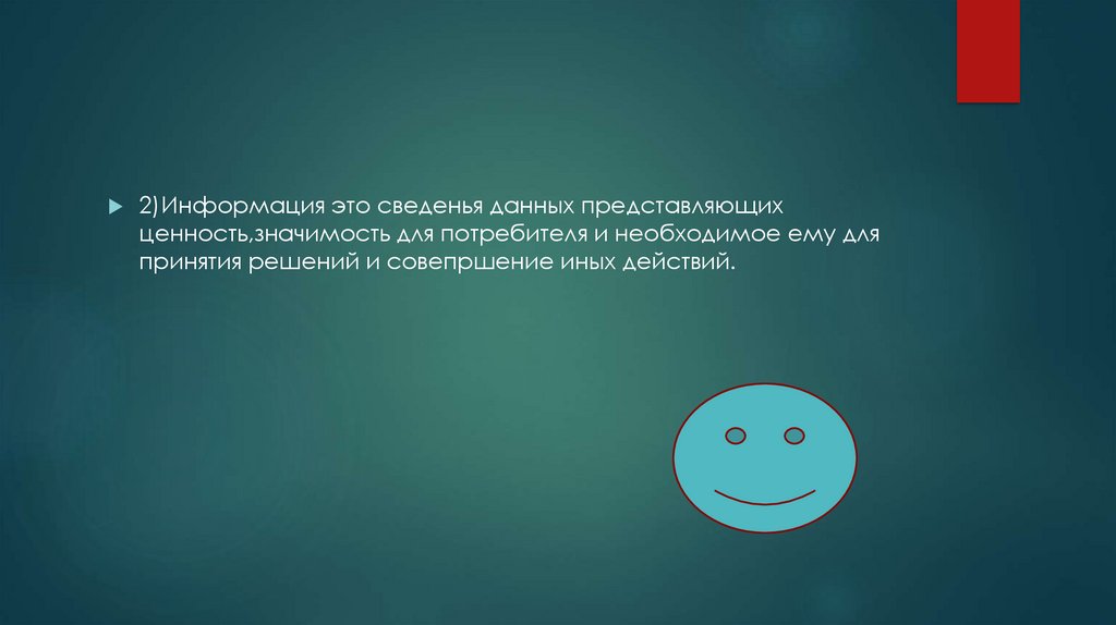 2)Информация это сведенья данных представляющихценность,значимость для потребителя и необходимое ему для