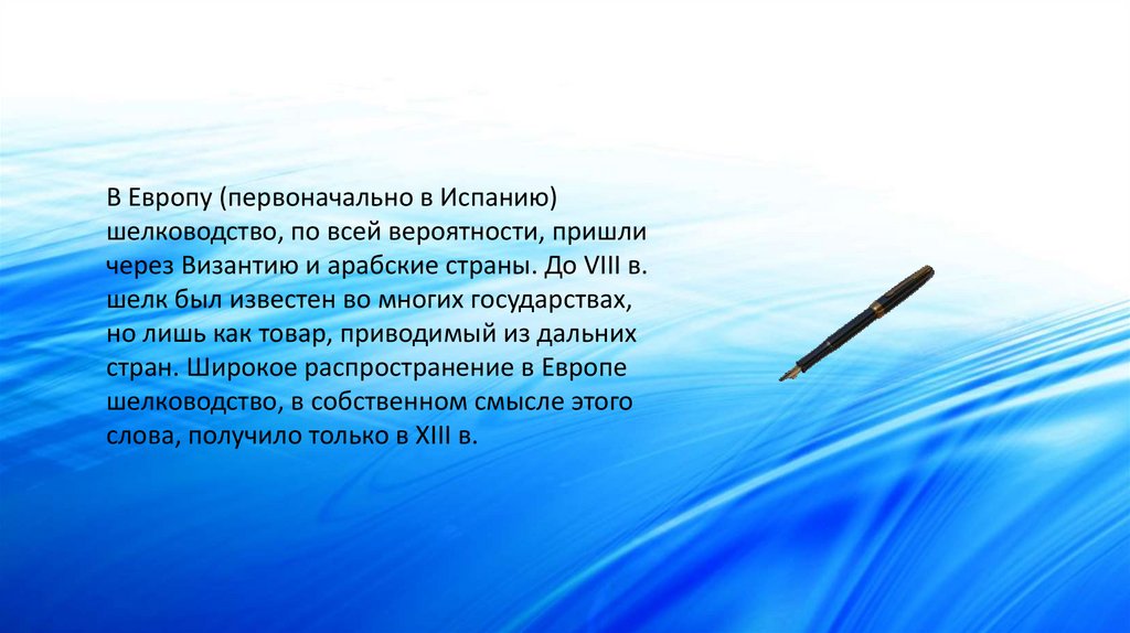 В Европу (первоначально в Испанию)шелководство, по всей вероятности, пришли