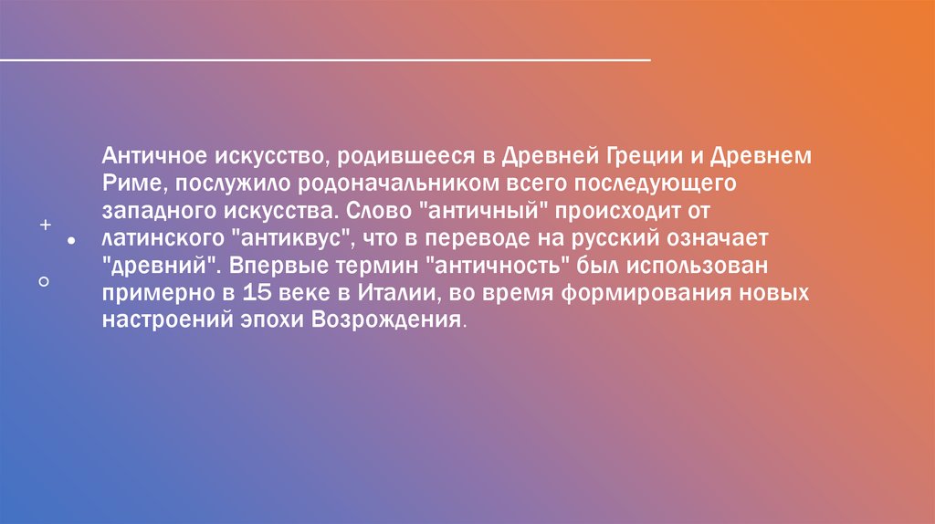 Античное искусство, родившееся в Древней Греции и ДревнемРиме, послужило родоначальником всего последующего
