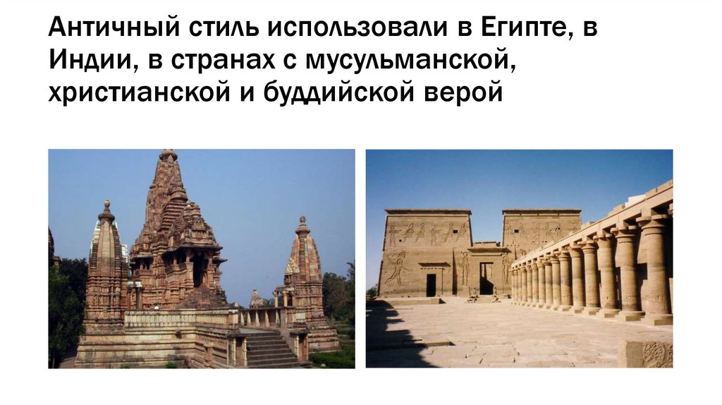 Античный стиль использовали в Египте, вИндии, в странах с мусульманской,