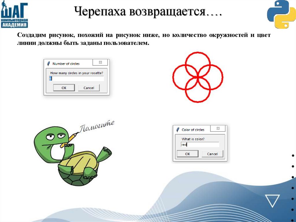 Черепаха возвращается….Создадим рисунок, похожий на рисунок ниже, но количество окружностей и цвет