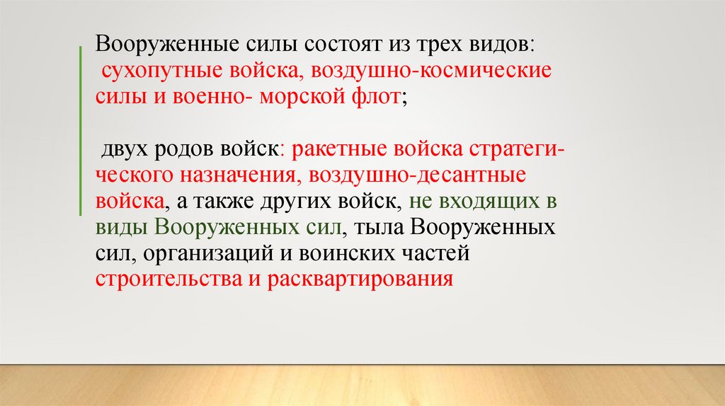 Вооруженные силы состоят из трех видов:сухопутные войска, воздушно-космические