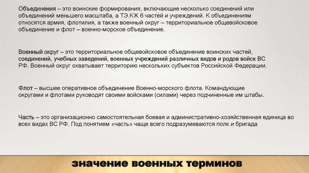 Объединения — это воинские формирования, включающие несколько соединений илиобъединений меньшего масштаба, а ТЭ.КЖ 6 частей и учреждений. К объединениям