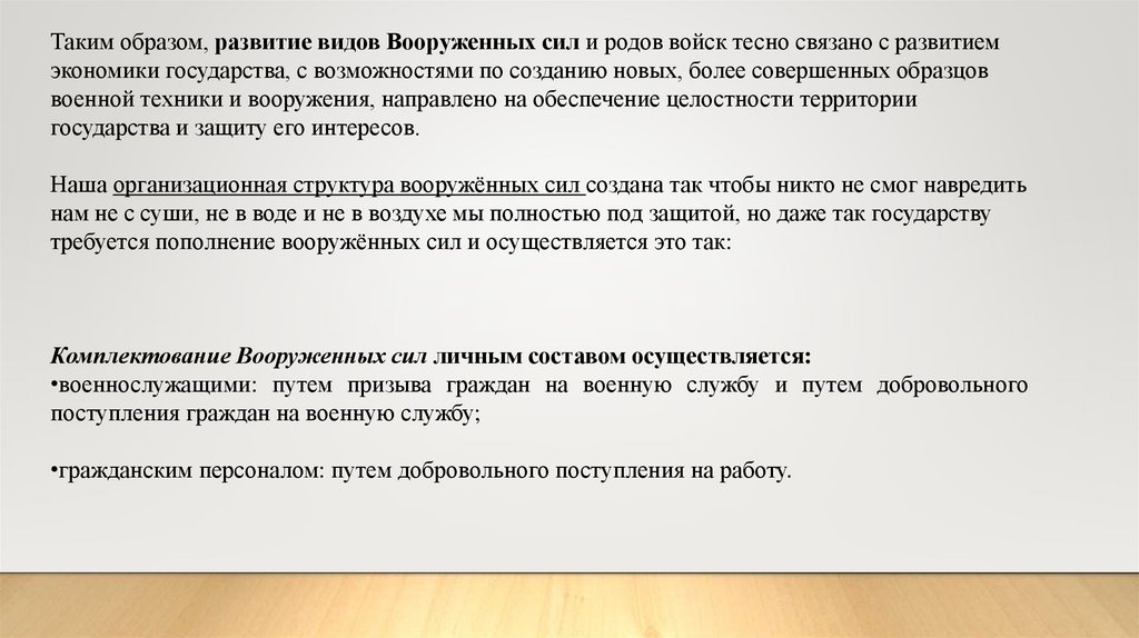 Таким образом, развитие видов Вооруженных сил и родов войск тесно связано с развитиемэкономики государства, с возможностями по созданию новых, более совершенных образцов