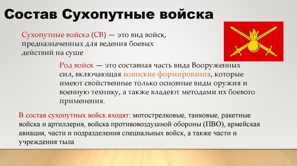 Состав Сухопутные войскаСухопутные войска (СВ) — это вид войск,