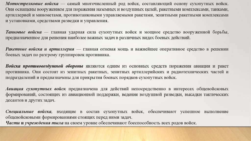 Мотострелковые войска — самый многочисленный род войск, составляющий основу сухопутных войск.Они оснащены вооружением для поражения наземных и воздушных целей, ракетными комплексами, танками,