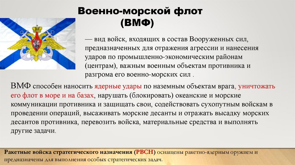Вид Вооруженных сил (ВС)— это часть Вооруженных силгосударства предназначенная для ведения военных действий в