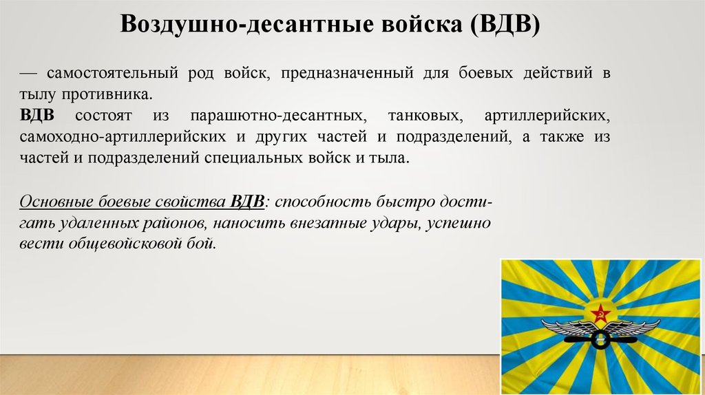 Воздушно-десантные войска (ВДВ)— самостоятельный род войск, предназначенный для боевых действий в