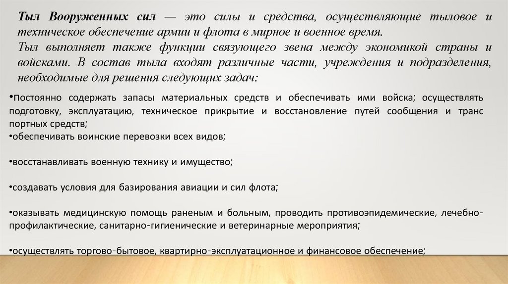 Тыл Вооруженных сил — это силы и средства, осуществляющие тыловое итехническое обеспечение армии и флота в мирное и военное время.