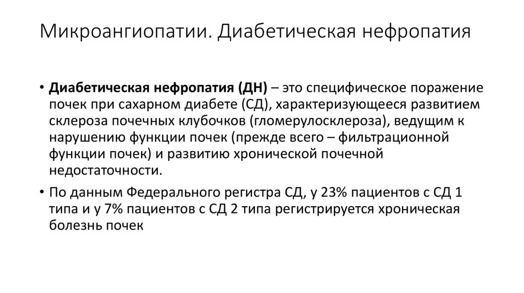 Микроангиопатии. Диабетическая нефропатия• Диабетическая нефропатия (ДН) – это специфическое поражение