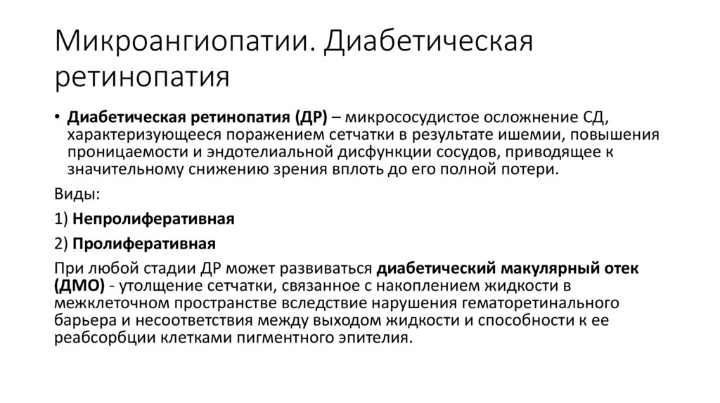 • Диабетическая ретинопатия (ДР) – микрососудистое осложнение СД,