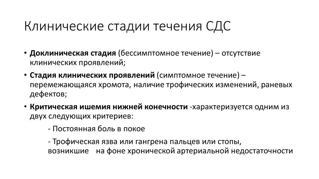Клинические стадии течения СДС• Доклиническая стадия (бессимптомное течение) – отсутствие