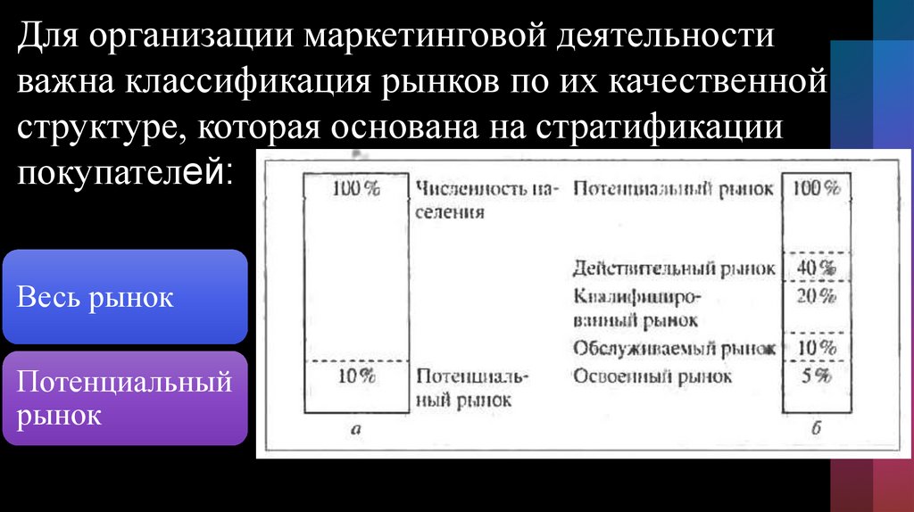 Для организации маркетинговой деятельностиважна классификация рынков по их качественной